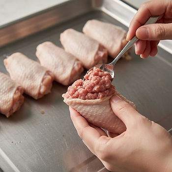 Eniko started her filling first, correctly cooling it before assembly. She used the pasta machine to roll her dough, which was acceptable, but cut wrappers very small. The mushroom pieces were quite chunky rather than finely diced. The filling lacked depth of flavour — mainly onions, garlic, and mushrooms without the full range of Korean seasonings available. She was unfamiliar with some ingredients (gochugaru, Szechuan pepper) but identified them by smell. Her dipping sauce was vinegar-heavy. The dumplings were undersized but did not burst. She finished just in time.